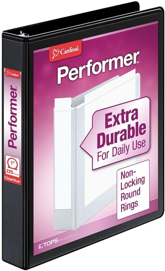 Cardinal Performer 1" Binders have non-locking round rings that hold up to 225 sheets. ClearVue covers let you customize all 3 sides for a professional-looking view from any angle. PVC-free & nonstick with 2 clear interior pockets.